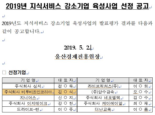 2019년 지식서비스 강소기업 육성사업 대상기업에 하기와 같이 선정되었습니다.
